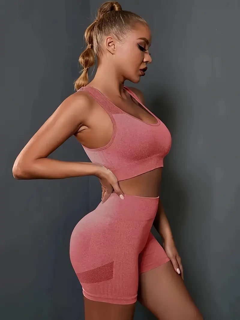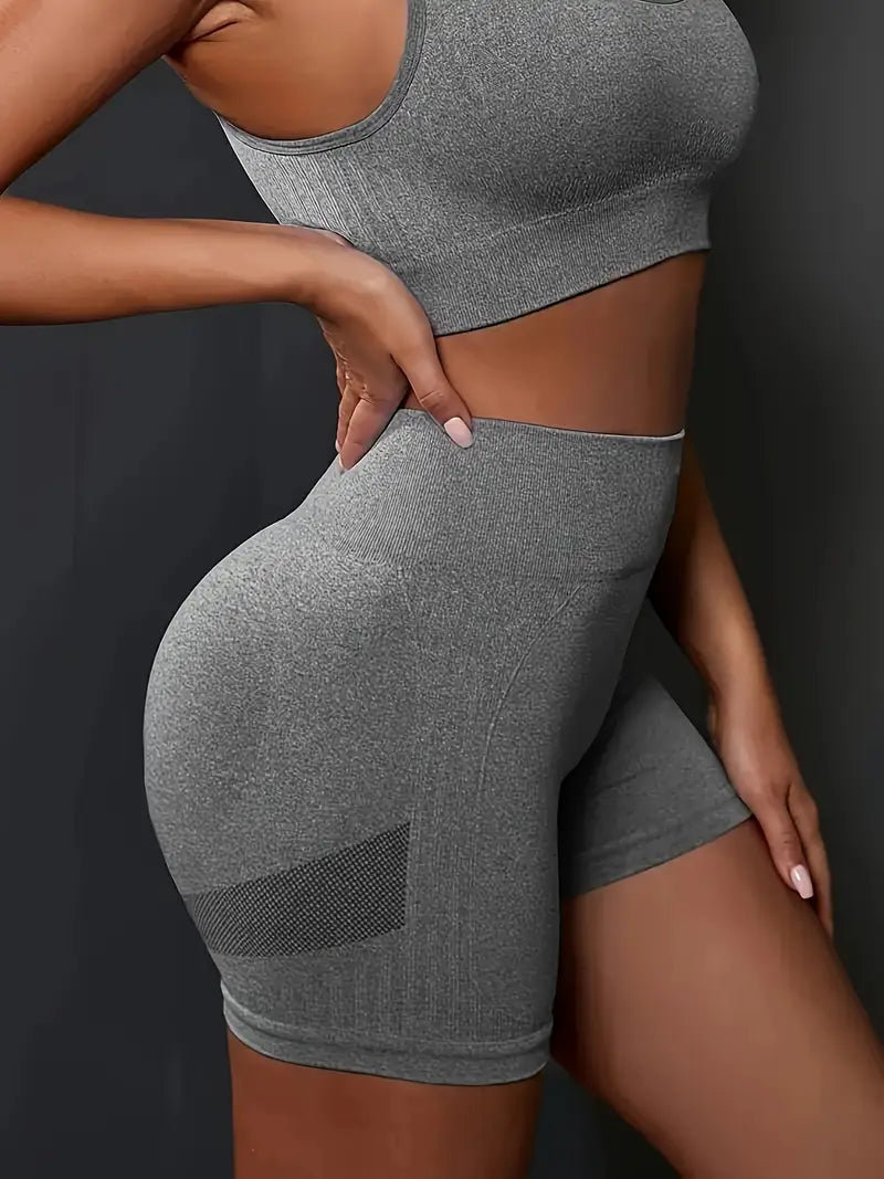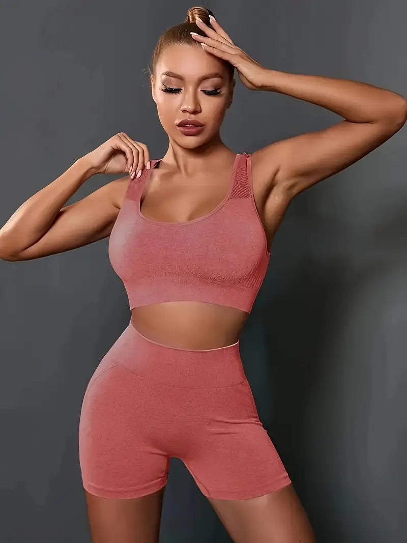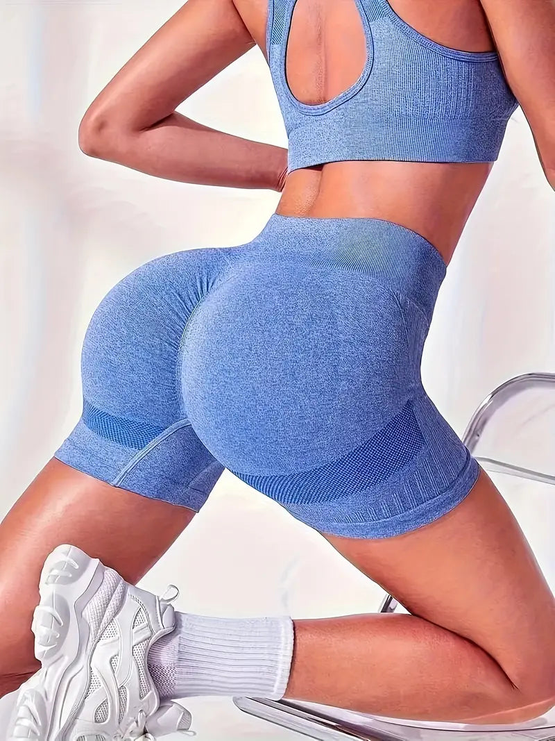 Bešavni sportski top pruža podršku pri svakom pokretu, dok push-up zona na šorcu vizuelno podiže i oblikuje obline.